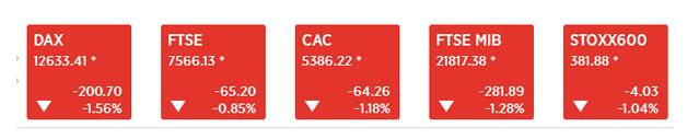 欧洲股市:欧洲股市全线低开低走,欧洲斯托克600指数低开0.6%;英国富时100指数低开0.8%;法国CAC40指数低开1.2%;德国DAX指数低开1.6%!