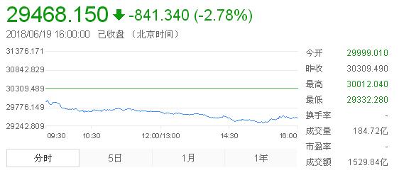 美股周一大体收跌,道指连续第五个交易日下滑。美国和中国这两个全球最大的经济体之间的贸易局势持续紧张,令市场承压。今日开盘,恒生指数(29468.15, -841.34, -2.78%)低开1.02%,报29999.01点,失守30000点关口。此后走势不断走低。盘中更是跌超2%,跌超3%。截至收盘,恒指大跌2.78%,报29468.15点;国企指数暴跌3.18%,报11492.77点;红筹指数跌3.02%,报4438.14点。大市成交1529.84亿港元。