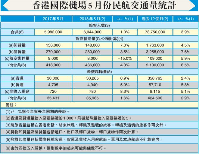至於在今年首5個月,機場共接待旅客3070萬人次,處理的貨物及航空郵件達203萬公噸,分別同比增加3%及4.1%。飛機起降量則較2017年同期上升2.3%至17.59萬架次。於過去12個月,機場客運量達7380萬人次,貨運及航空郵件量達513萬公噸,飛機起降量則達42.46萬架次,三項數據分別同比增加3.9%、6.5%及2.9%。