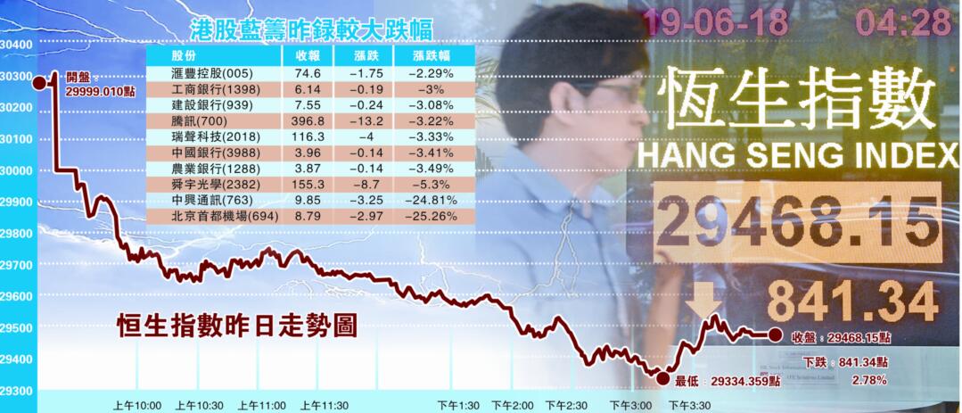 【香港商報网訊】記者潘晶報道:昨日是端午假后首個交易日,受中美貿易戰升級影響,港股復市開市即失守30000點,此后更一路下行,最多曾跌977點,最終收報29468.15點,跌幅841.34點或2.78%;國指幅度更大,昨跌377點或3.18%。全日成交額亦放大至1529.84億元。滬港通及深港通南下交易全日分別净流出6.1億及5.52億元人民幣。綜合市場分析,當前環球股市氛圍偏淡,投資者宜持盈保泰。(相關報道刊A2版)