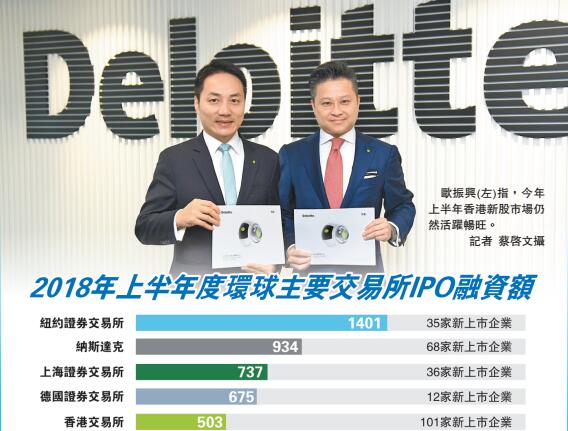 下半年將面臨美元強勢、中美貿易關系轉趨緊張,以及英國脫歐的不確定性持續等問題。德勤分析,下半年本港將有最少5隻集資額最少100億元的新股,并與金融服務、科技和消費行業相關。但由於目前申請上市名單以中小型申請人為主,因此德勤維持全年本港將有大約180隻新股、集資1600億元至1900億元的預測。歐振興指,該集資額或令香港市場在全球集資排名晉身三甲。