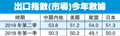 此外,歐盟信心指數自2011年以來首次重回增長區間,由2018年第一季度的49.1升至第二季度的54,較其他市場更高。中國內地排名第二,指數為53.8。出口商對日本及美國的信心也有所回升。