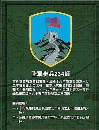 据了解,台陆军第6军团、第8军团以及海军陆战队的臂章,至今都是之前中国秋海棠地图的形象,机步234旅的臂章则有万里长城图案,被称为“长城部队”。“长城部队”由蒋介石命名,其盾形徽章的主体是万里长城古北口雄踞于青山之上,“青天白日满地红”旗飘扬在蔚蓝天空,目的在于激励军人勿忘长城古北口战役,随时为整军备战而努力。