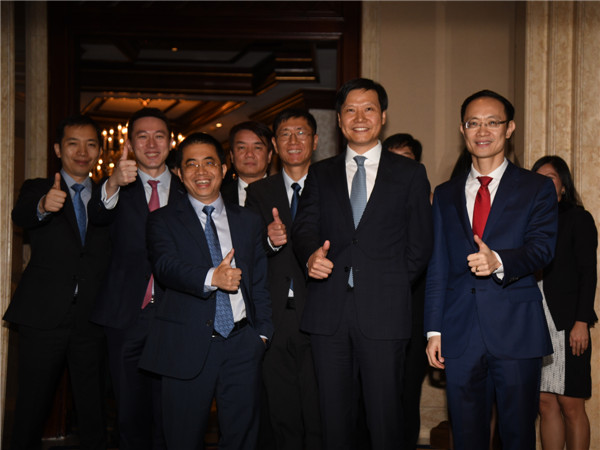 雷军(前排右二)偕小米管理层出席推介会。