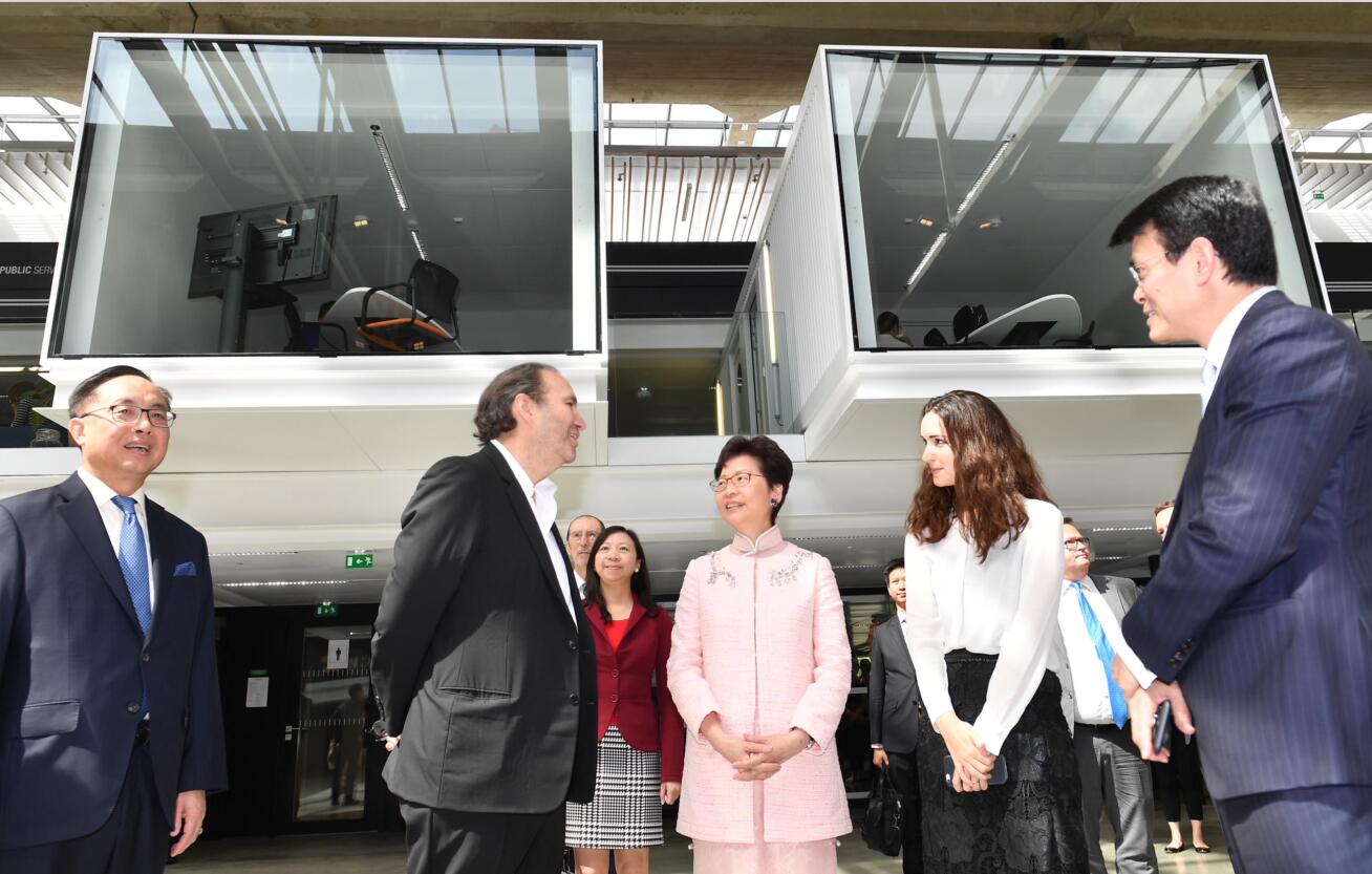 林鄭一行之後到初創企業孵化器StationF參觀。StationF去年中開幕,位於一個舊鐵路貨運倉庫,佔地約34000平方米,是世界其中一個最大的初創企業設施,能容納3000間初創企業。林鄭十分欣賞StationF的設備、服務及創業氛圍,並在與場內創業者的交流中,得悉StationF為他們提供了極佳的支持。她希望未來香港及粵港澳大灣區能有更多類似設施,鼓勵青年創新創業。