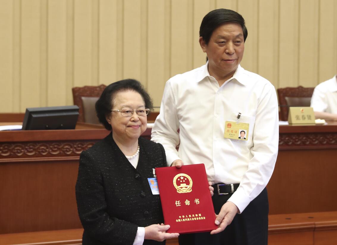 栗戰書向副主任譚惠珠頒發任命書。