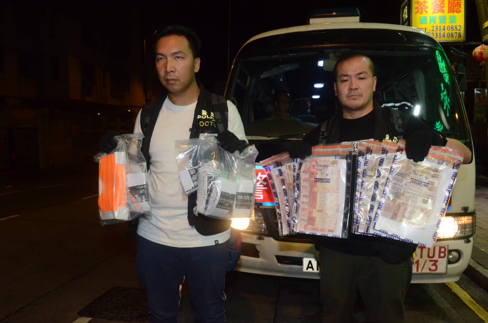 行動中,警方還檢獲約12萬元現金、小量懷疑可卡因、8支鐵通、3把刀、9部手提電話、1部電腦及總額約1500元的懷疑非法投注紀錄。