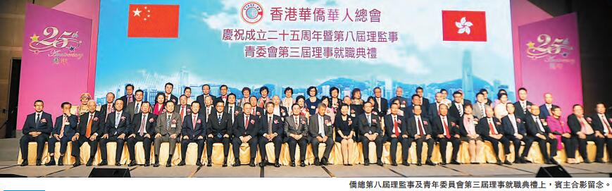 【香港商報网訊】記者郭天琪報道:香港華僑華人總會慶祝成立二十五周年暨第八屆理監事及青年委員會第三屆理事就職典禮日前舉行,中國僑聯副主席喬衛,福建省省委常委、統戰部部長雷春美,中聯辦協調部部長沈冲,特區政府民政事務局副局長陳積志,外交部駐港副特派員趙建凱,全國人大常委譚耀宗,香港僑界社團聯會會長余國春,中國僑聯副主席陳有慶、許榮茂,全國政協常委周安達源等蒞臨主禮。陳進強榮膺會長,梁淦基榮膺監事長;梁煒茵、林仕超分別榮膺青委會主席及執行主席,與近千名來賓共同慶賀履新。