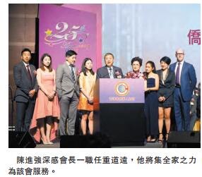 新屆會長陳進強深感任重道遠。他表示,該會是擁有廣泛群眾基礎的愛國愛港群體,希望能把僑青發展得更好,將集全家之力為該會服務,希望父輩的愛國傳統可以成為家風,代代相傳。
