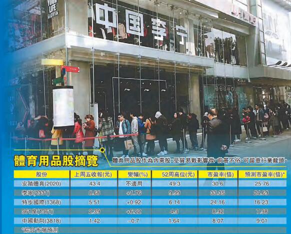 市場恐懼中美貿易戰硝烟再起,拖累港股上周累跌970點或3.2%,不少資金流入內需股避險,早前被沽空機構狙擊的體育用品股逆市向上。展望內地消費升級趨勢持續,市場憧憬世界盃熱潮進一步刺激體育用品銷售,體育用品股前景可看高一線,安踏體育(2020)、李寧(2331)及特步國際(1368)值得留意。香港商報記者 林德芬