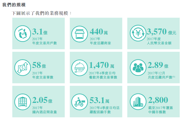 招股书披露,2017年,美团完成交易笔数超过58亿,交易金额约3570亿元。其中,年度活跃商家为440万,年度交易用户数达到3.1亿。