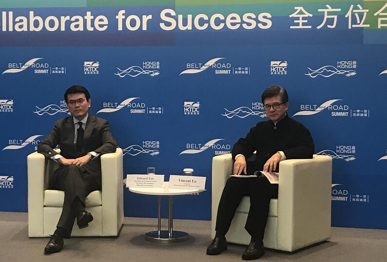 商務及經濟發展局局長邱騰華(圖左)回顧特區政府一年來在「帶路」的工作方針指,可用5個P來形容,分別是政策、定位、專業服務、項目及夥伴。他續指,現時香港的主要貿易夥伴由歐美轉向東盟國家,而本港在面對中美貿易摩擦等挑戰時,需要擴大經貿合作關係,才能不斷發展。