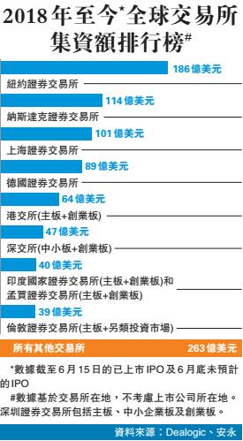 他續說:「若這3間企業成功於下半年上市,將帶動下半年集資額達2000億元,令香港重登全球集資額三甲地位。」他補充,若上述當中任何一間未能成功於下半年上市,將對全年集資額帶來很大影響,故今年的集資額較難預測。此外,中美貿易戰走向也對市場氣氛造成一定影響。