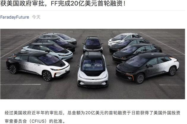 另一方面,FF也在今日(6月25日)下午宣布,经过美国政府近半年的审批后,其总金额为20亿美元的首轮融资于日前获得了美国外国投资审查委员会(CFIUS)的批准。据记者了解,此次FF首轮融资20亿美元主要来自于已被恒大健康收购100%股份的香港时颖公司。
