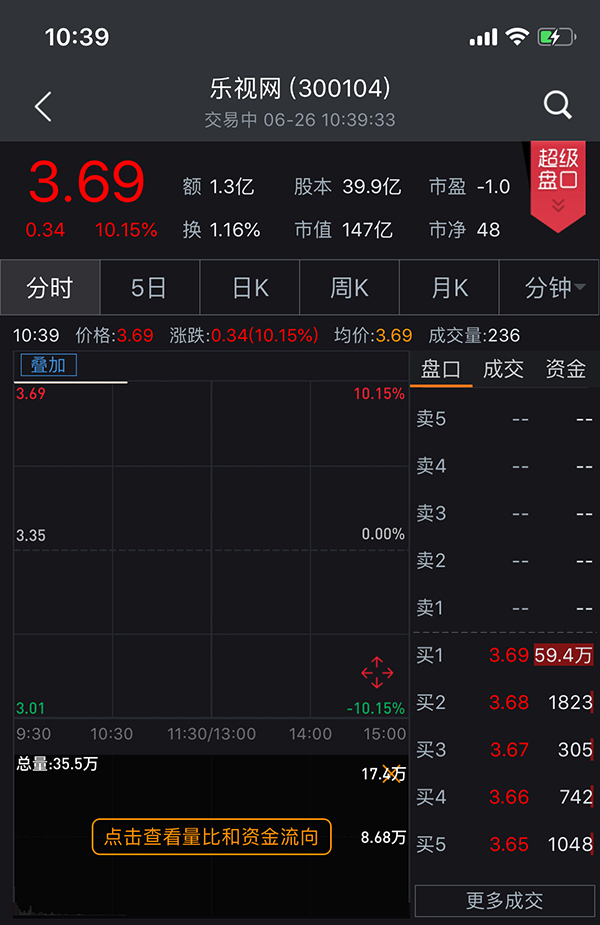 截至上午收盘,乐视网以10.15%的涨幅收出“一字板”,54万手大单封住涨停板,报3.69元/股,成交额达1.4亿元,换手率1.2%。