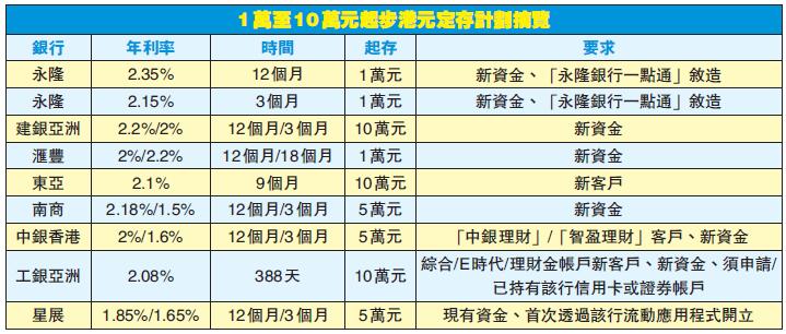 比較多間銀行1年期港元定存計劃,以永隆銀行最吸引和靈活,最低1萬元已可入場,年利率最高達到2.35%,須透過該行的手機應用程式「永隆銀行一點通」敘造,而且要求新資金。假設敘造最低1萬元定存,一年便可賺息235元。