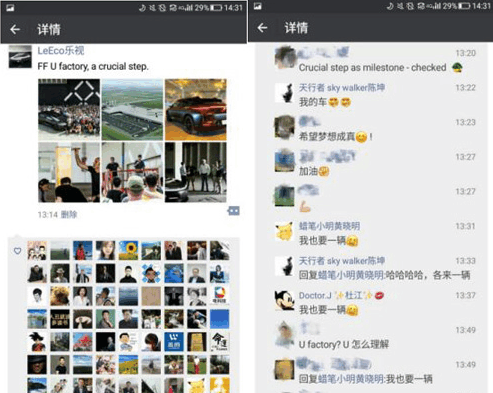 证券日报记者注意到,乐视汽车生态董事长贾跃亭于8月7日在朋友圈发布了新工厂揭幕的多张照片,并写下“FF U factory,a crucial step。”该条朋友圈随即获得了大量点赞和评论,其中不乏一些明星大咖,比如陈坤就评论说“我的车!”,黄晓明和杜江等也纷纷回复:“我也要一辆”,还有众多人为贾跃亭造车的这一重要进展表示了支持和鼓励。