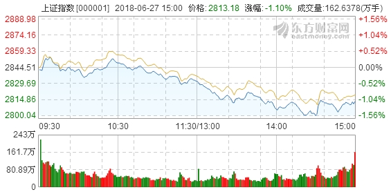 【香港商报网讯】6月27日消息,今日早盘沪深两市微幅低开,随后逐渐下行,沪指盘中失守2800点,最低触及2798.80点,随后快速拉起,回到2800点上方。上证50今日大跌超2%,成砸盘元凶。深成指盘中最深跌幅超2%,而昨日表现良好的创业板指今日暴跌1%。截止收盘,沪指报2813.18点,跌幅1.10%,深成指报9168.66点,跌幅1.83%;创指报1546.23点,跌幅1.19%。