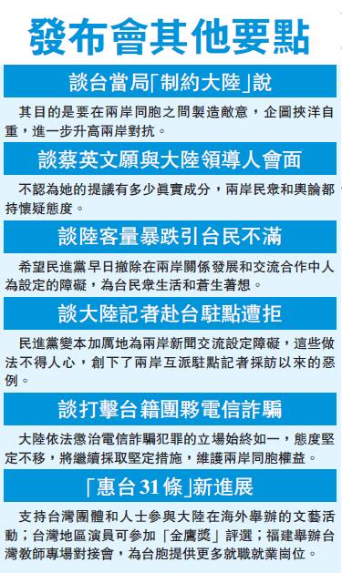 在昨天舉行的國台辦例行記者會上,有記者提及「時代力量」日前稱台立法機構應展開「公投法」修法補正,將「領土變更」等內容放入「公投」的選項。對此,馬曉光強調,堅決反對任何勢力以任何方式,包括以所謂「立法修法」的方式進行「台獨」分裂活動,或者為「台獨」分裂活動打開方便之門。他還表示,「台獨」是一條走不通的邪路,損害的是台灣同胞的利益。警告「台獨」勢力不要玩火自焚。