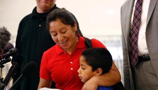 当地时间2018年6月22日,美国马里兰州林西克姆,一对母子在巴尔的摩/华盛顿瑟古德-马歇尔国际机场团聚。