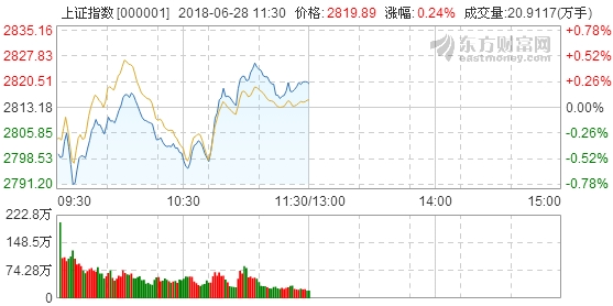 【香港商报网讯】6月28日消息,早盘沪深两市低开后迎来一波杀跌,沪指盘初快速下探,最低触及2790.40点,多空胶着,在2800点展开争夺,随后券商股崛起,提振市场人气,沪指逐渐上行;创业板指早盘持续高位震荡。临近午盘,证券、银行板块异动拉升带动沪指翻红。截至午间收盘,沪指涨0.2%,创业板板指涨1%。黄金T+D午间收盘,涨0.1%。