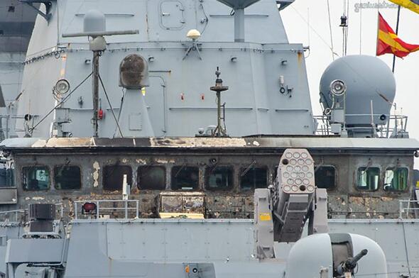 德国海军新闻网站发布的照片显示,爆炸烧焦了舰桥正面和下方的发射单元,两名德国海军受轻伤。