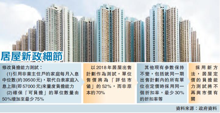 行政長官林鄭月娥昨公布新房屋政策,其中備受注目的是修改資助出售房屋訂價機制。在新訂價機制之下,居屋會以非業主住戶的家庭每月入息中位數計算負擔能力來計價,倘以今期推售的新居屋作測試,單位售價的「評估市值」,將會由現時的市值7折發售,變成52折,能擁有自己的安樂窩,是很多港人的夢想,新房策令資助出售房屋更加可以負擔,助市民上車安居,絕對應該讚好。惟林鄭亦承認,今次推出的新措施不能壓抑樓價或增加房屋供應,因此在調整房策先解民困之餘,最關鍵的拓地問題上應有實質性進展,這需要全社會的共同支持。