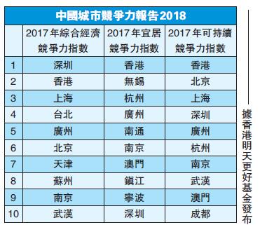 報告指出,2017年綜合經濟競爭力指數排名前十位依次為深圳、香港、上海、台北、廣州、北京、天津、蘇州、南京和武漢,大部分集中在珠三角、長三角、環渤海和港澳台地區,反映沿海地區有持續領先優勢。當中南京上升明顯,成功打入十強,而澳門則首次跌出十強。