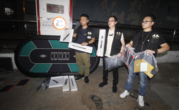 探隊展示檢獲的賭枱、武器及帳簿等證物。