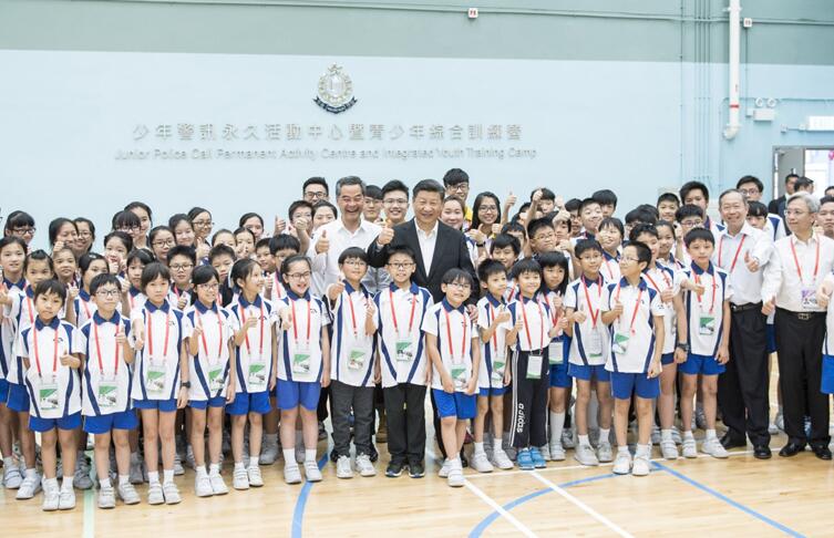 2017年6月30日,國家主席習近平來到香港少年警訊永久活動中心暨青少年綜合訓練營考察,看望正在訓練的香港青少年。這是習近平同少年警訊成員合影。资料图