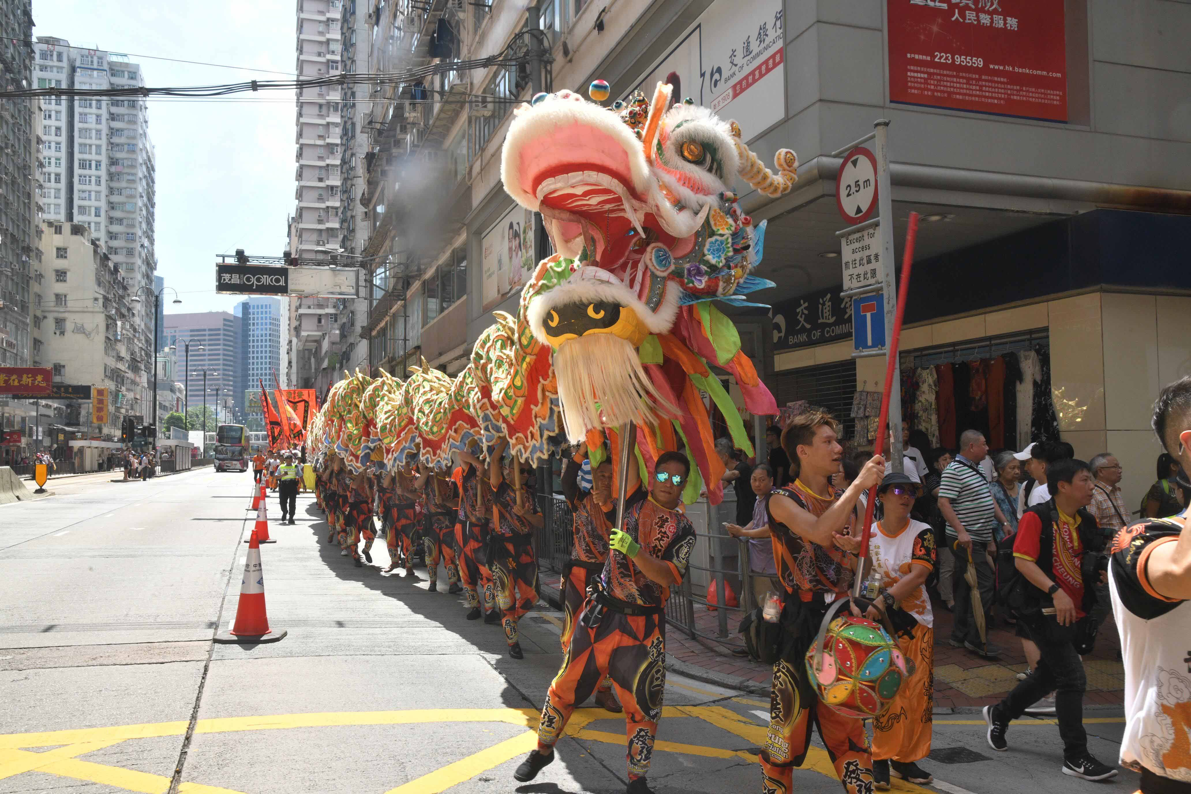 在昨早,慶委會特別舉行了「粵港澳大灣區慶回歸龍獅大巡遊」,逾400頭來自大灣區11個城市的醒獅、金龍等瑞獸,在警方安排下,由鰂魚涌公園經北角英皇道鬧市巡遊至香港維多利亞公園,途經英皇道期間,隊伍與途人互動,共慶香港回歸祖國21周年,場面熱鬧。