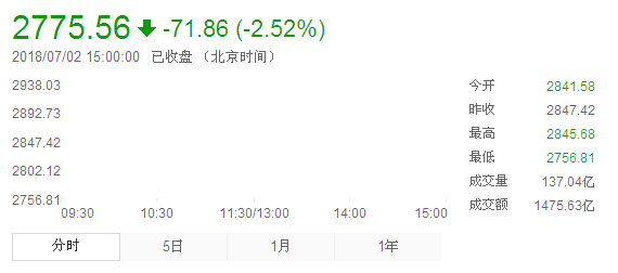 A股今日迎来7月份首个交易日,也是下半年首个交易日,沪指低开后一路单边下行,收盘重挫2.52%,再创2016年3月以来的两年多新低,收报2775.56点。两市合计成交3576亿元,行业板块全线下跌。