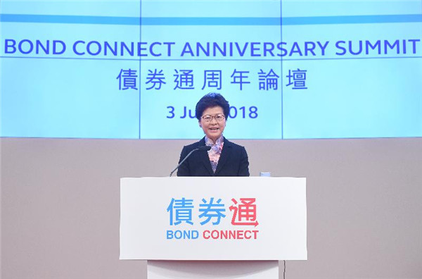林鄭月娥指出,債券通是深化內地與香港資本市場互聯互通的重要里程碑,是內地首次允許合資格的境外投資者通過內地與境外債券市場的基建連接,投資於內地銀行間債券市場。