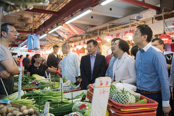 在炎炎夏日下,無冷氣裝置的公眾街市儼如火爐,《財政預算案》提出預留20億元推行街市現代化政策,為公營街市安裝冷氣及翻新。陳肇始昨日陪同多名立法會議員巡視觀塘瑞和街市及熟食中心、香港仔街市、灣仔街市。