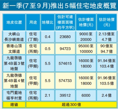 美聯測量師行董事林子彬則指出,值得留意的是,雖然政府早前公布將撥多幅啟德用地作資助房屋發展,但新季度5幅住宅地皮中,仍有2幅啟德區住宅地推出,分別位於第4B區3號地盤及4號地盤。兩地面積相若,假若兩地皮以每呎樓面地價約16000元計算,估值分別為91.94億元及91.96億元。