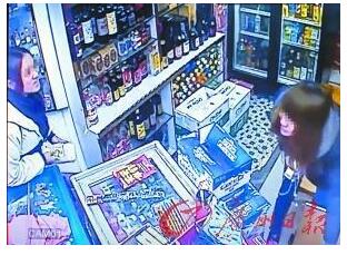 士多的监控拍到女生(左)到店内买烟的过程。此时,老板娘(右)正从货柜拿烟。