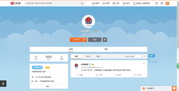 中國海警官方微博昨日發布首條消息,目前粉絲超過5萬,首條微博消息被轉發約2萬次,獲十幾萬個點讚。網絡截圖