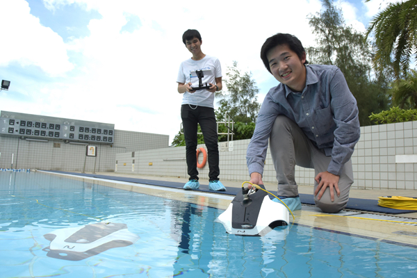 Andreas Widy(右)與Henry Liyanto在游泳池展示研發的潜拍機,及模擬水底拍攝工作。