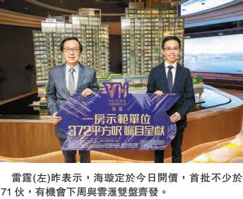 雷霆表示,項目早前預告第三季開價推細單位,現時剛剛踏入第三季,形容「準時確實執行」,并指未來兩天公布首張價單,強調與雲會雙盤齊發,好大機會下周發售。雷霆再次重申,集團空置單位情况不嚴重。新地代理總經理陳漢麟表示,項目首批單位全部位於5A座,周六(7日)起收票,下周開售。