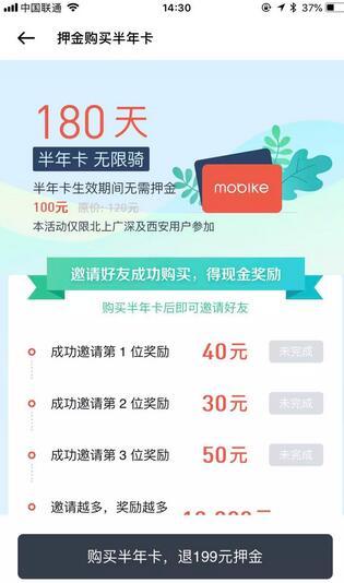 摩拜方面解释称,100元年卡是近期活动,今天宣布全国免押金,退还通道正在优化中。