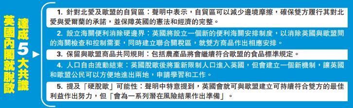 英國計劃於明年3月29日正式脫歐,時間愈來愈緊迫,但談判一波三折,雙方仍在許多重要議題上毫無進展,令人擔心無法趕及在最後限期前達成最後協議,勢必令金融市場增加不明朗因素。內閣今次取得共識,總算令文翠珊鬆一口氣。不過有分析認為,執政保守黨內的疑歐派將對此感到憤怒,因為他們會覺得英國只是在名義上脫離了歐盟關稅聯盟及單一市場,但實際上和脫歐前根本沒什麼分別。