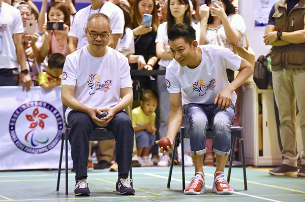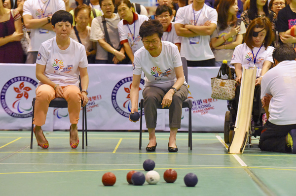 行政長官林鄭月娥(中)昨出席香港殘奧日活動并親身落場試玩硬地滾球。中通社