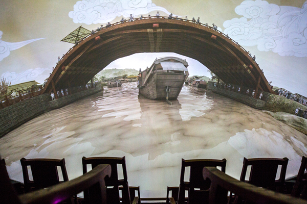 科技發展讓這一夢想變為現實。《清明上河圖3.0》就運用多種科技手段包括8K超高清數位互動技術、4D動感影像,以及各種藝術形態,讓觀眾與作品實現多層次交互體驗,人們可以在新穎的感受中領略傳統文化的生命力。本次展覽共有《清明上河圖》巨幅互動長卷、孫羊店沉浸劇場、虹橋球幕影院3個展廳,以及1個北宋人文空間,從各種維度最大化地營造觀展的沉浸感和互動性。