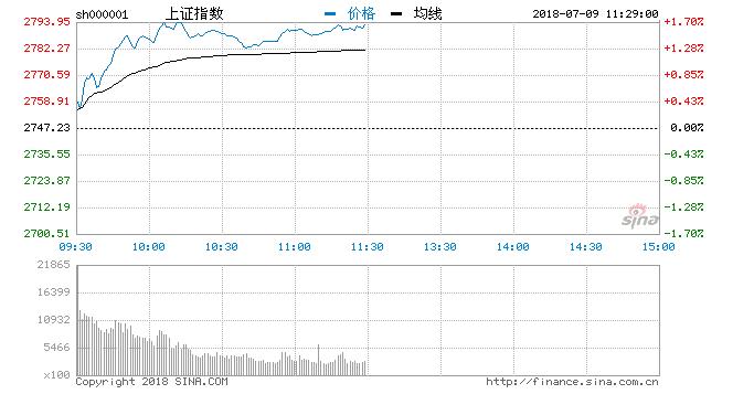 7月9日,沪深两市双双高开,早盘银行、保险等金融股反弹,家电、医药等消费板块亦拉升,上证50指数盘中涨逾2%,带动沪指高开高走,涨逾1.5%,盘中逼近2800点。此外,电子等科技类板块早盘走强,题材股表现活跃,创业板指涨逾2%。盘面上,行业板块全线飘红,电子、休闲服务等领涨。题材概念方面,可燃冰、草甘膦、智能音箱等指数领涨。两市成交量较上一交易日略有放量。