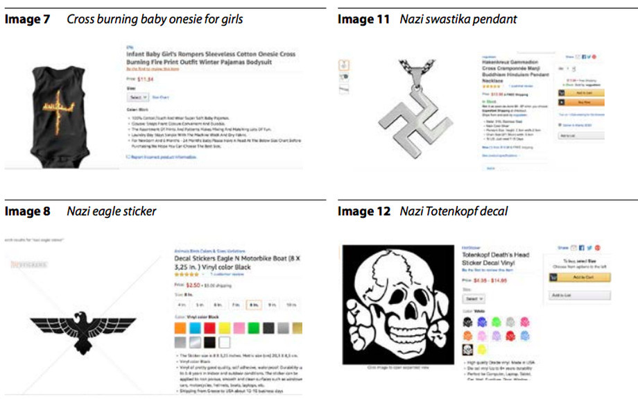 该报告由工薪家庭伙伴关系(Partnership for Working Families)和种族经济行动中心(Action Center on Race & the Economy)两大游说组织公布,说是在亚马逊上发现了处于正常销售状态中的纳粹十字花饰吊坠、带有纳粹图像的贴纸、德国纳粹党卫军军官帽。报告指出,虽然这些商品的销售总额目前还不得而知,但很明显针对儿童进行了销售广告策划,比如说以纳粹为主题的青蛙佩佩(Pepe the Frog)指尖陀螺以及带有火烧十字图案的儿童连体衣。