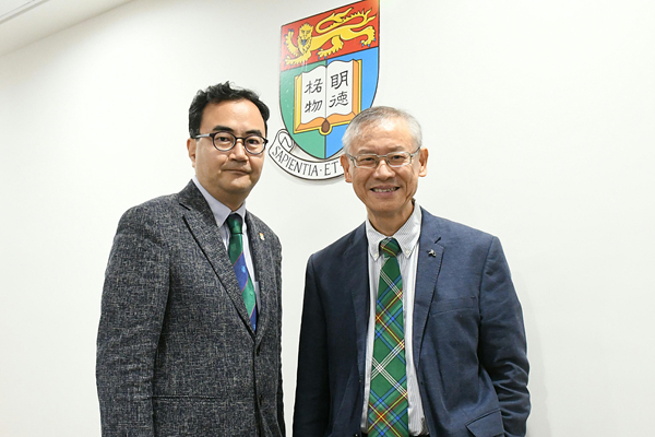 港大副校長賀子森(右)與港大技術轉移處處長金信哲(左)講述與廣藥大的合作計劃。記者馮瀚文攝