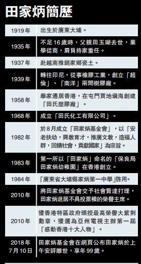 昨日,田家炳基金會於網頁發布《田家炳博士訃告》。訃告指出,本會創辦人、大紫荊勳賢田家炳於7月10日上午安詳辭世,享年99歲。基金會全體仝寅表示無比的懷念及深切的哀悼。田家炳一生愛國、愛港、愛鄉,早年於南洋創業,1958年舉家移居香港,憑堅毅精神及辛勤耕耘,創辦化工實業,為業界翹楚。1982年創辦田家炳基金會,以「回饋社會、貢獻國家」為宗旨,致力捐辦社會公益事業,尤重教育,惠澤全國。