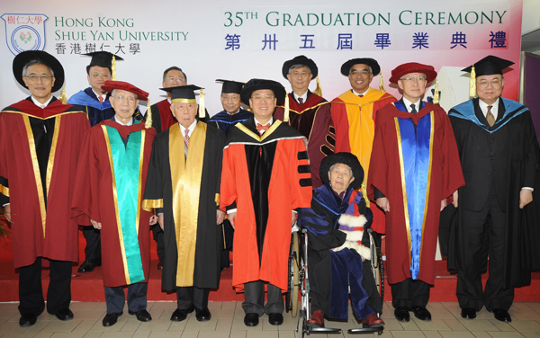 2009年11月20日,時任行政長官曾蔭權在香港樹仁大學校園主持第35屆畢業典禮時,榮譽博士學位得主田家炳博士(前排左二)與其他主禮嘉賓合照。