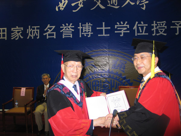 田家炳(左)於2008年獲得西安交大名譽博士學位。