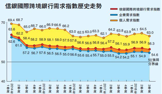 今年第三季跨境銀行需求指數為56.3,較上一季度下跌0.6。